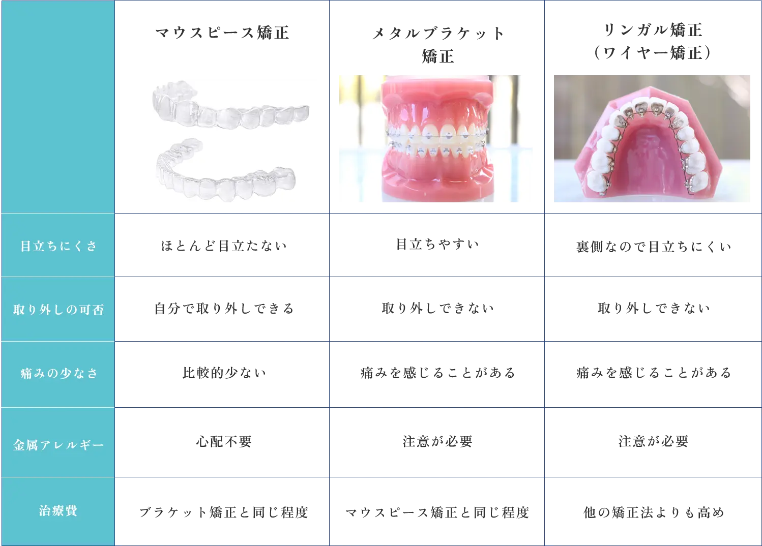 - 矯正歯科装置などにより金属等のアレルギー症状が出ることがあります。