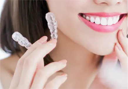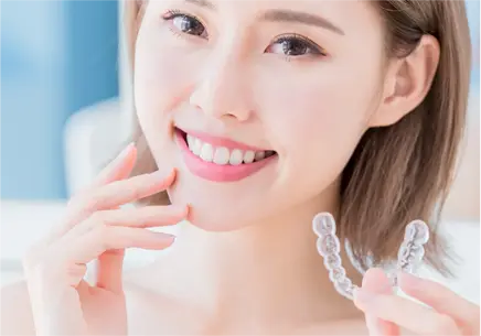 マウスピース型矯正装置(インビザライン)とは、透明なマウスピース型の矯正装置を用いて歯並びを整えていく治療法です。食事や歯みがきの際はご自身で取り外せるので、衛生的にお使いいただけます。受診時に複数枚の矯正装置をお渡しするため、通院回数が少なく済みます。仕事やプライベートとの両立も可能です。